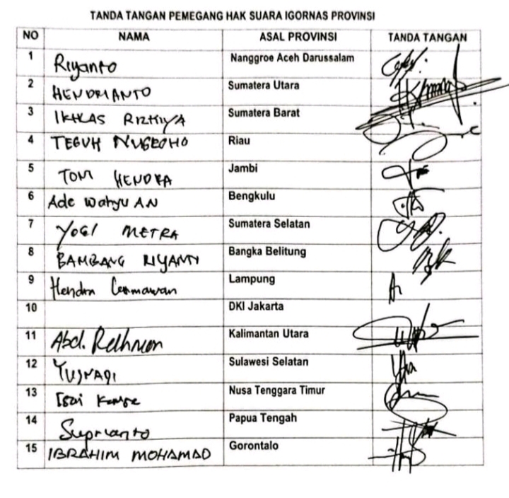 Jakarta, – Musyawarah Nasional I yang di laksanakan di Jakarta bertempat di Hotel Grand Mercure kemayoran pada tanggal 8 s.d 10 Agustus 2025 diduga dipenuhi dengan hal-hal yang tidak procedural mulai dari tahapan munas sampai dengan kegiatan munas sendiri maka dari itu 14 ketua Umum Provinsi sebagai pemegang hak suara yaitu Provinsi Nanggroe Aceh Darussalam, Provinsi Sumatera Utara, Provinsi Sumatera Barat, Provinsi Riau, Provinsi Jambi, Provinsi Bengkulu, Provinsi Sumatera Selatan, Provinsi Bangka Belitung, Provinsi Lampung, Provinsi Kalimantan Utara, Provinsi Sulawesi Selatan, Provinsi Gorontalo, Provinsi Nusa Tenggara Timur, dan Provinsi Papua Tengah, Membuat surat mosi tidak percaya terhadap pengurus pusat dalam pembentuka SC dan OC serta ketua panitia pelaksana dalam pelaksanaan MUNAS dan surat ini akan di kirimkan ke Bapak Menteri Pemuda Olahraga sebagai Penasehat IGORNAS