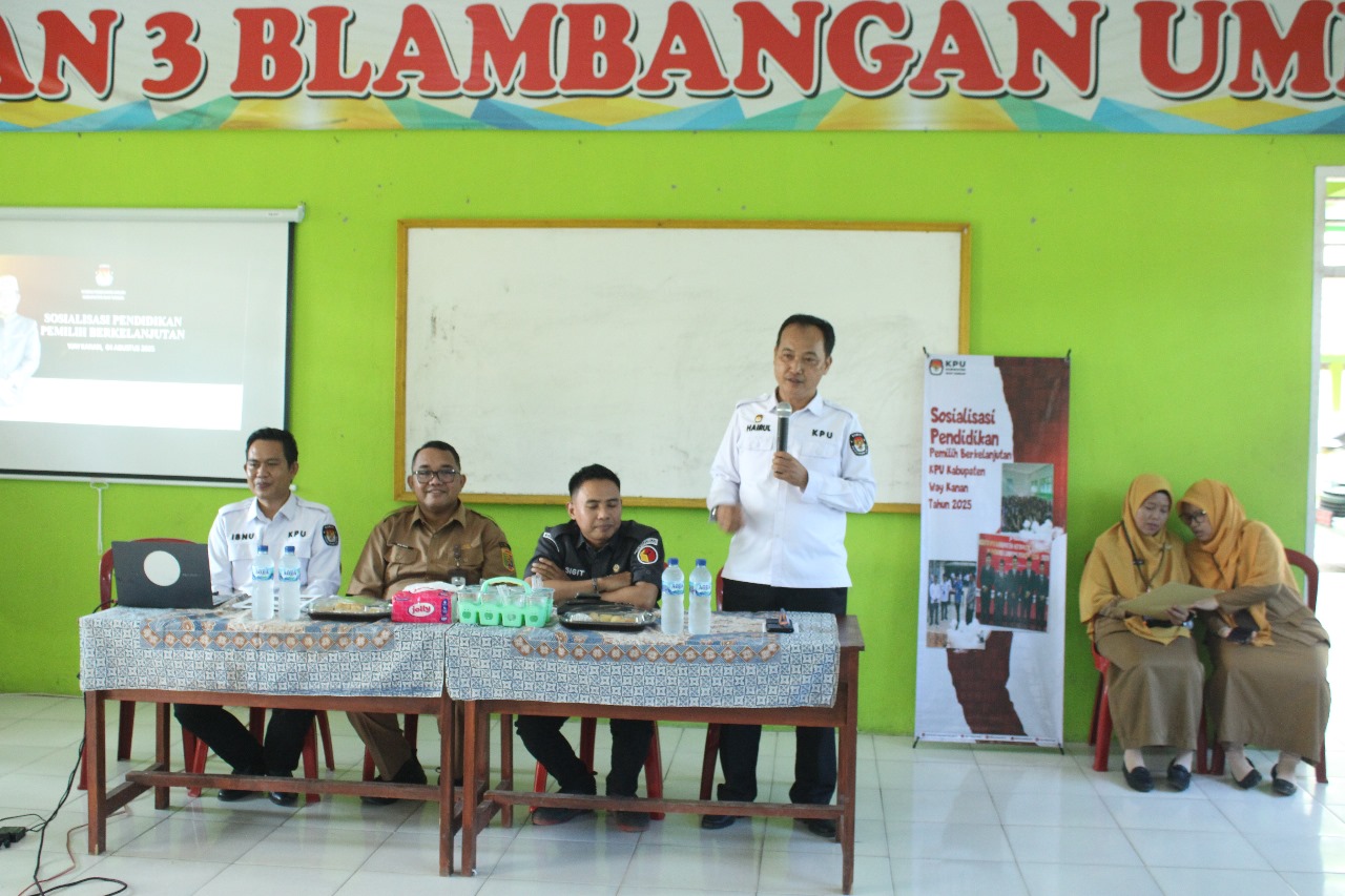 Way Kanan, – Komisi Pemilihan Umum (KPU) dan Badan Pengawas Pemilu (Bawaslu) Kabupaten Way Kanan melaksanakan kegiatan Sosialisasi Pendidikan Pemilih Berkelanjutan di SMAN 3 Blambangan Umpu, Senin 4 Agustus 2025.