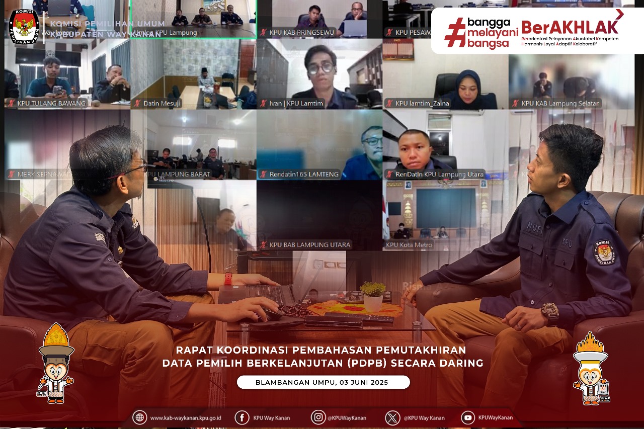 Dari KPU Kabupaten Way Kanan, rapat ini diikuti oleh Divisi Perencanaan, Data dan Informasi (Rendatin) Nufi M. Yusuf, Kasubbag Rendatin Yandi Nezara, serta Admin Sidalih Hery