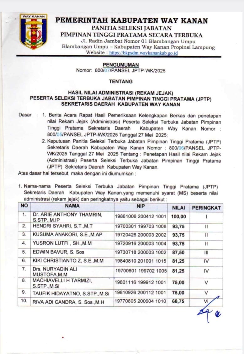 Way Kanan – Pemerintah Kabupaten Way Kanan melelui Panitia Seleksi Jabatan Pimpinan Tinggi Pratama Secara terbuka mengeluarkan Pengumuman Nomor : 800/07/PANSEL JPTP-WK/2025 Tentang Hasil Nilai Administrasi (Rekam Jejak) Peserta Seleksi Terbuka Jabatan Tinggi Pimpinan Tinggi Pratama (JPTP) Sekretaris Daerah Kabupaten Way Kanan tertanggal 28 Mei 2025