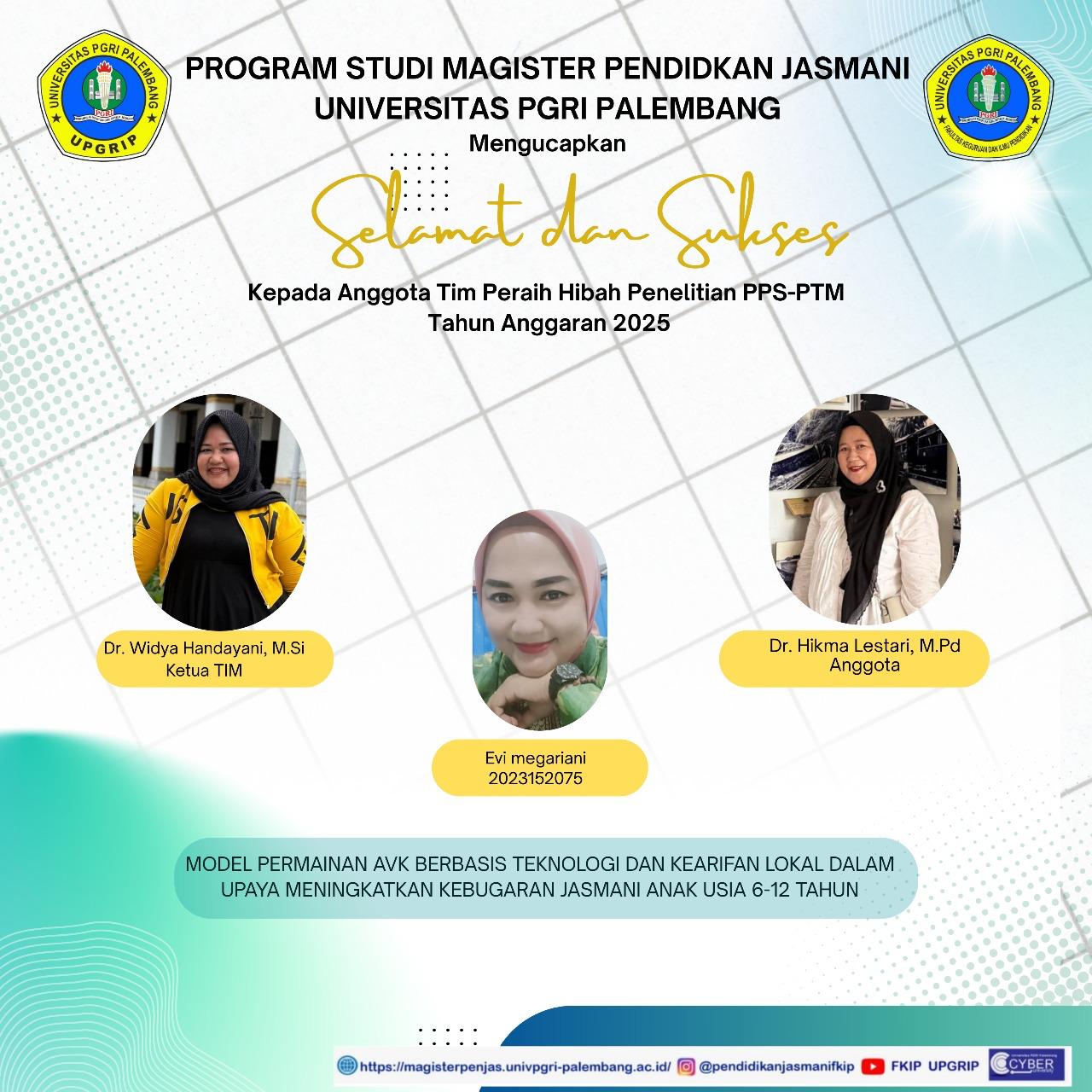 1. Dr. Widya Handayani, M.Si.(Peraih Hibah Penelitian Fundamental (PFR) dan PPS-PTM (Penelitian Tesis Mahasiswa) atas nama Evi Megariani Nim 2023152075 dari Sumber Dana DPPM Kemdiktisaintek 2025)